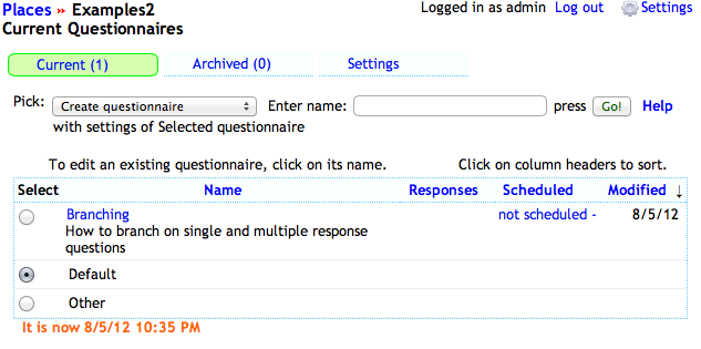 To create a new questionnaire, select Create Questionnaire from the Pick drop-down menu, and enter a name for it. Names must only use letters, numbers, and _ (underscore). To use the same questionnaire settings as a previously created survey, select it by clicking on the radio button next to it in the Select column. Then press Go!