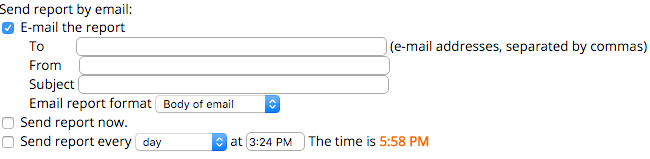 When you click on the E-mail the report checkbox, other options appear that let you enter a list of e-mail addresses in the To field, a From e-mail address, and an email Subject. A dropdown menu lets you choose between sending the report embedded in the body of the email, as an HTML attachment, or as a CSV attachment that can be opened in a spreadsheet. The "Send report now" checkbox sends an email immediately. The "Send report every" checkbox allows scheduling a report to be sent periodically as specified by the dropdown menu. NOTE that changing this dropdown will change the value of the report Period at the top of the page to a matching value. For example, if you pick a weekly report, the period will be changed to a week as well, but you might want a cummulative report of all the data. Just change tha value of the Period, at the top of the page, after specifiying how often you want the report to be sent. When a report does not include all data, an extra line appears in the emailed report showing the period chosen.