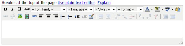 Clicking on Explain brings up this page in a small window. Clicking on Use HTML editor transforms the editing region into a fully functional text editor, and the link changes to "Use plain text editor". You can switch between the two editors at any time; any HTML you enter with the editor can be edited further as plain text.