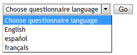 After the participant selects their language and presses Go, the browser redirects to the questionnaire in the chosen language. Only those languages for which a questionnaire is available are displayed in the menu, and the languages are displayed in their native name and character set. Chinese displays 中文, Arabic displays العربية and so on.
