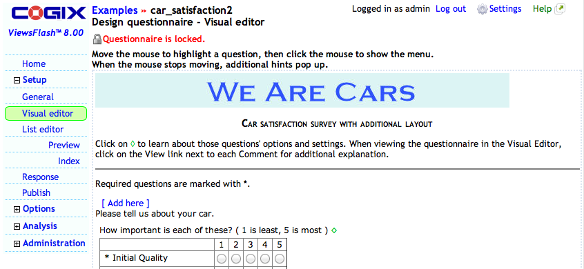 The software deals with Places, Questionnaires, Styles and Invite Lists. A place is where a user creates a series of questionnaires, protected by Access Controls. For instance, a company might have HR, Marketing, Sales, and Public places, where different users create surveys that run independently of each other. All questionnaires in each place must share the same Styles; a user who wants to create questionnaires with different styles needs to use more than one Place.